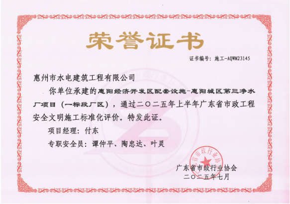 近日,由惠州水務(wù)集團水電公司承建的惠陽經(jīng)濟開發(fā)區(qū)配套設(shè)施—惠陽城區(qū)第三凈水廠項目(一標段廠區(qū)),順利通過2025年上半年“廣東省市政工程安全文明施工標準化”評價。這一榮譽不僅是對市水電公司項目管理與施工水平的高度肯定,更是對他們始終堅持高標準、嚴要求推進安全文明施工的生動詮釋,為行業(yè)樹立了可借鑒、可推廣的標桿典范。